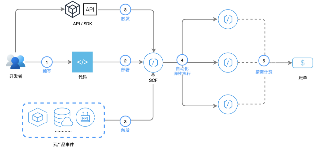 函数即服务和传统应用架构不同,函数即服务提供的是事件触发式的运行方式,云函数不是始终运行的状态,而是在事件发生时由事件触发运行,并且在一次运行的过程中处理这一次事件。因此在云函数的代码中,仅需考虑针对一个事件的处理流程,而针对大量事件的高并发处理,由平台实现云函数的多实例并发来支持。