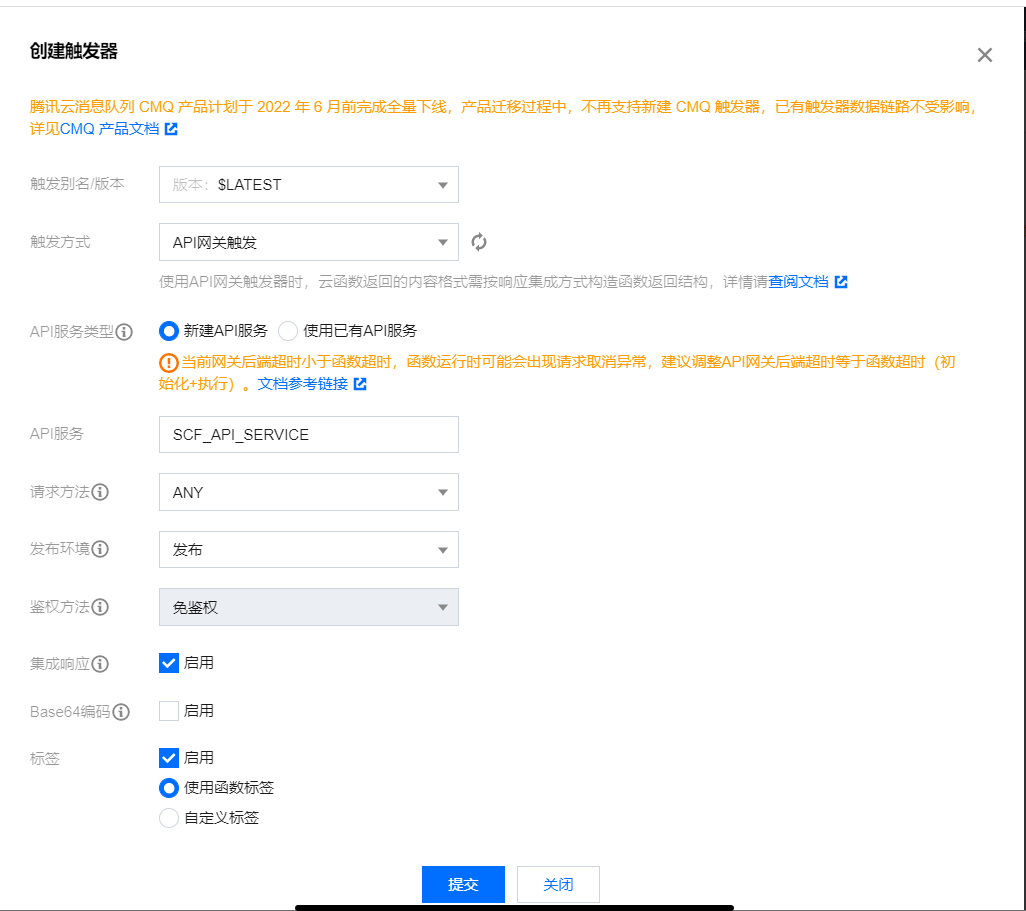 然后进入触发器中创建一个触发器。选择触发器版本为$LATEST,触发方式为API网关触发,开启集成响应。