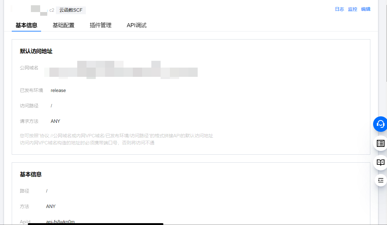 然后点击 API 服务名进入 API 网关页面进行配置,这里仅修改路径为/就可以,其他配置不用动