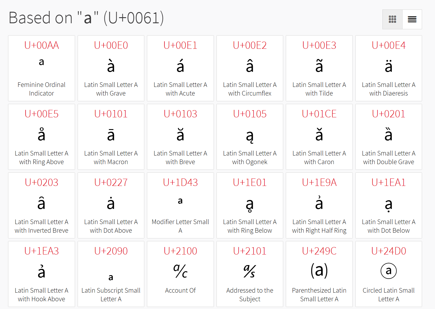 用https://www.compart.com/en/unicode/ 可以查看的到字符集(这里用a来做示例)