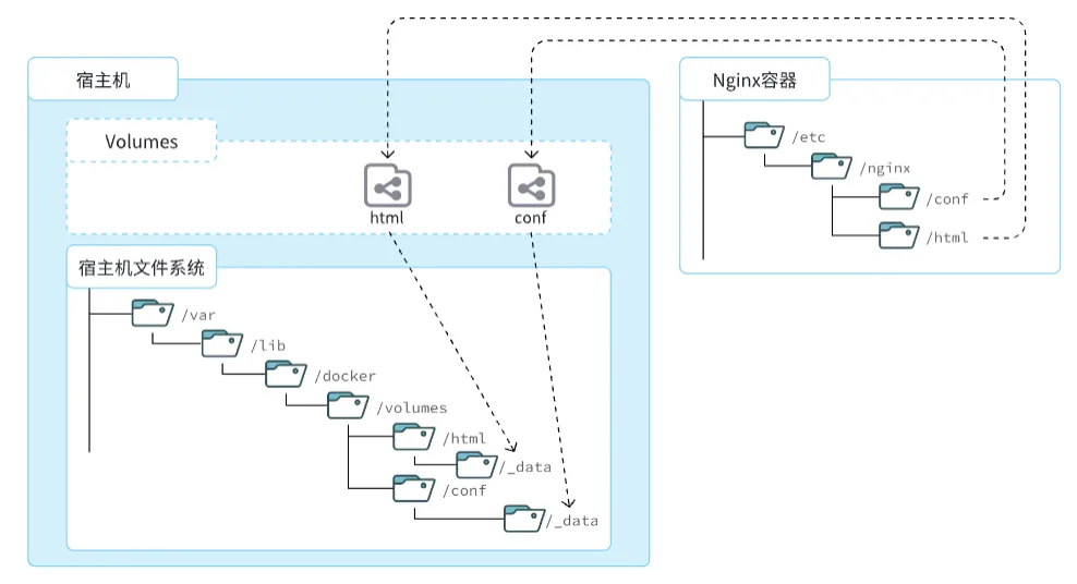 在上图中我们创建了两个数据卷:conf 和 html,Nginx 容器内部的两个目录分别与两个数据库关联,而数据卷 conf 和 html 分别指向了宿主机的/var/lib/docker/volumes/conf/_data